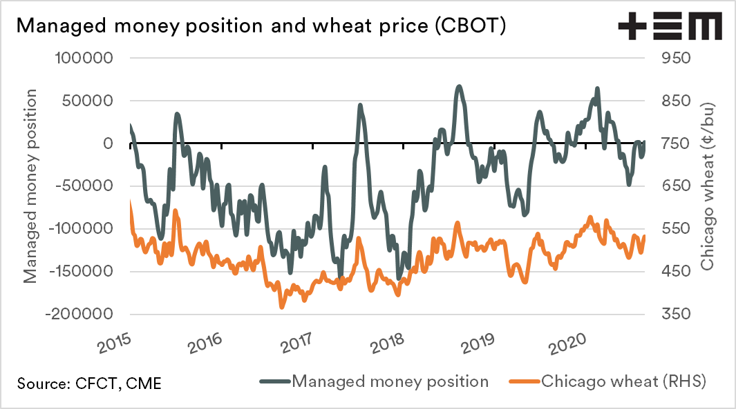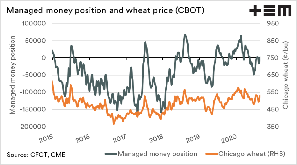 In the chart below, the position of speculators and the Chicago wheat price is displayed. There are periods where the speculators move to ‘net long’ positions, which coincides with large rises in pricing.
