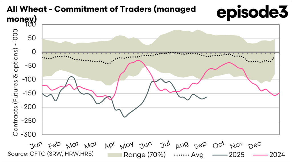 The first chart below shows the seasonality of the all wheat position (Chicago, Kansas and Minneapolis), it shows that they are betting on the wheat market falling further. That doesn’t mean they are right.