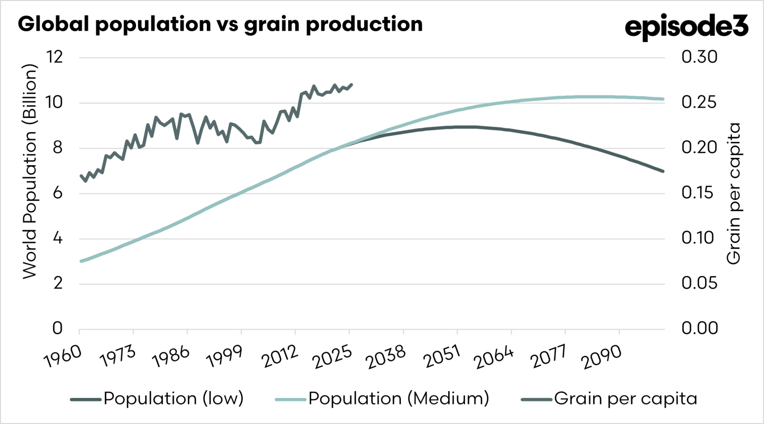 The chart below shows two of the central population projections to the end of this century, along with our grain production per capita.