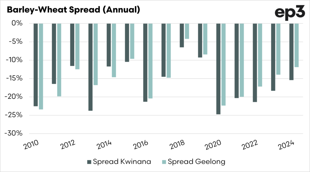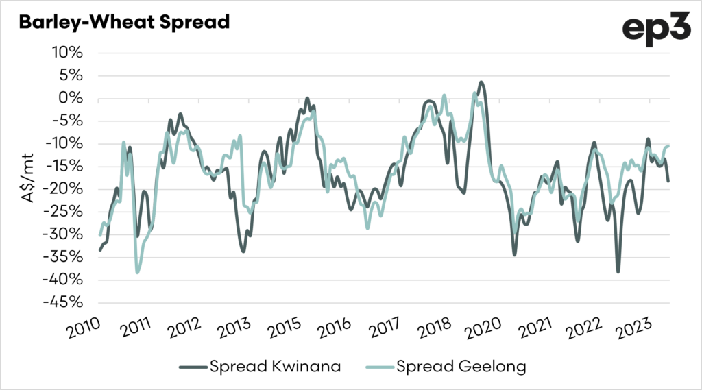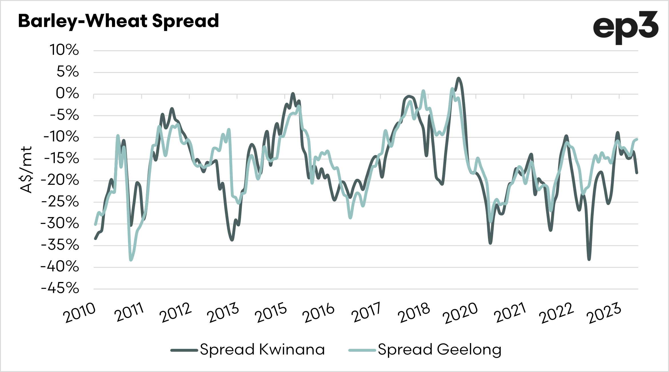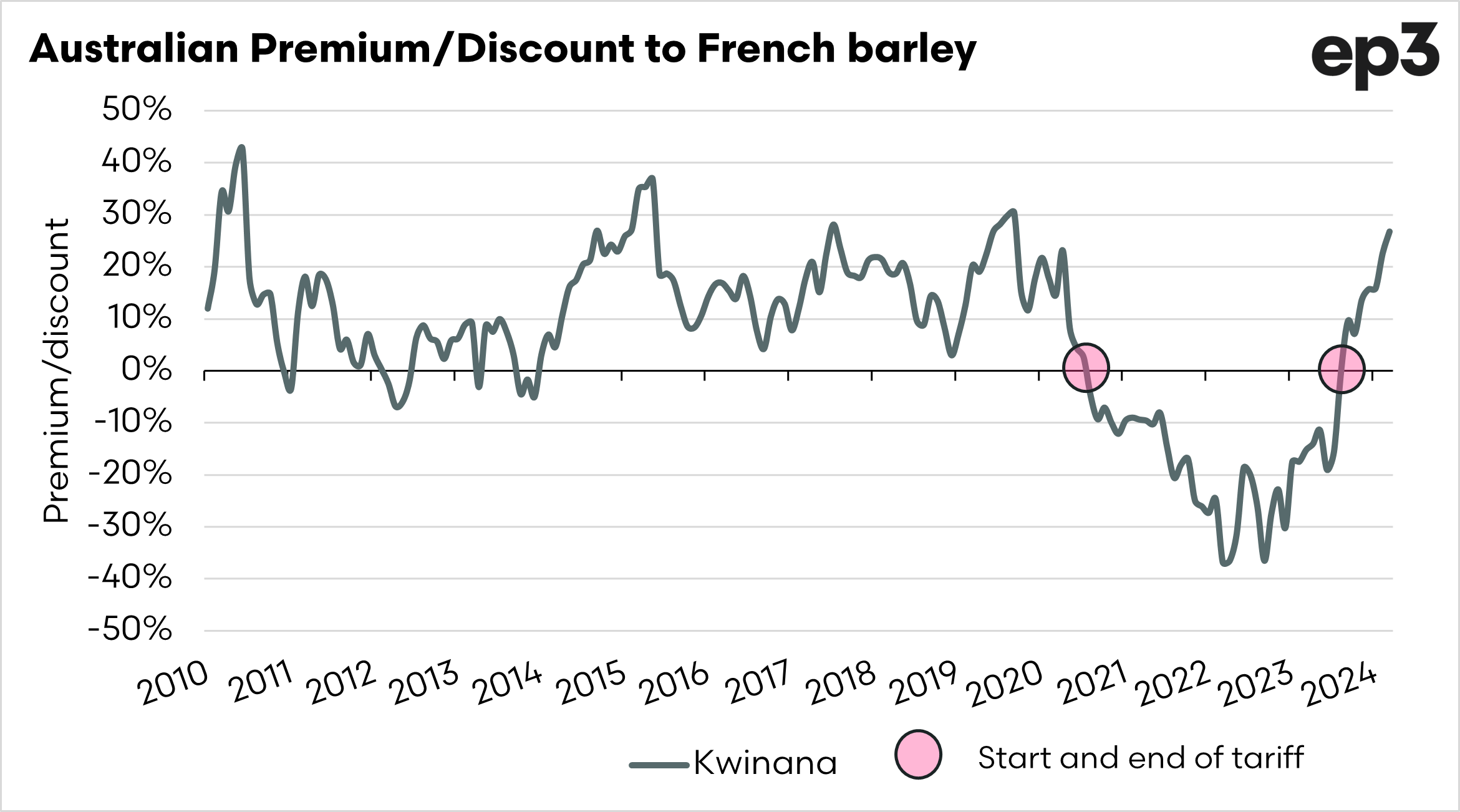 Australian barley has averaged an average discount of 20% to French barley since the turn of the decade. The current premium is now 20%, although this premium is stronger in the export-dominated Kwinana zone, with other states showing much smaller premiums.