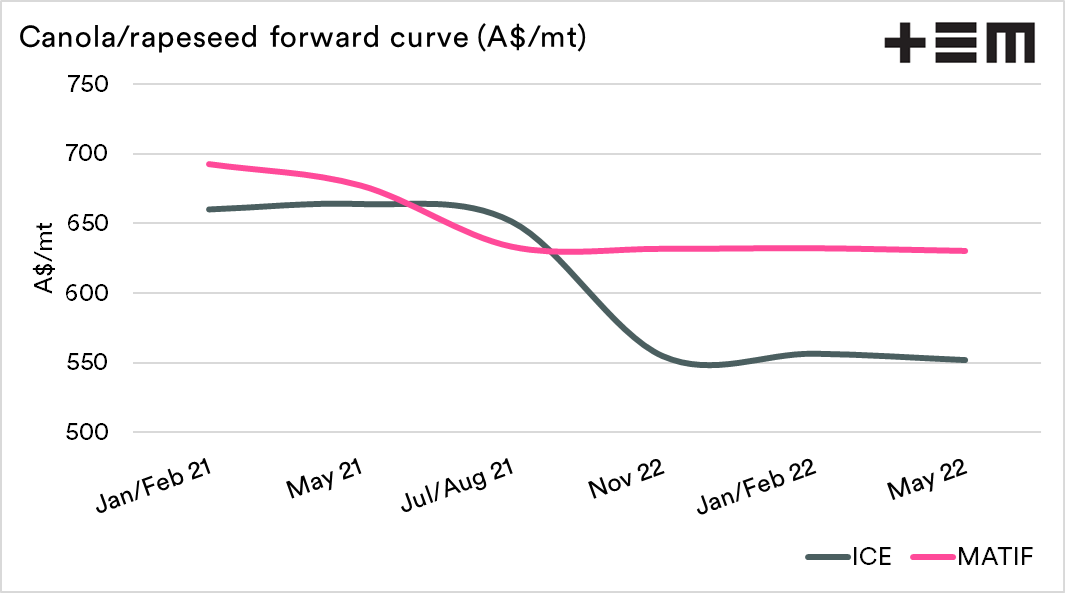 The chart below details the forward curve for both canola (ICE) and rapeseed (MATIF) expressed in A$/mt. As we can see, both futures markets are discounted for future months. This means the market is in backwardation – more to follow on that.
