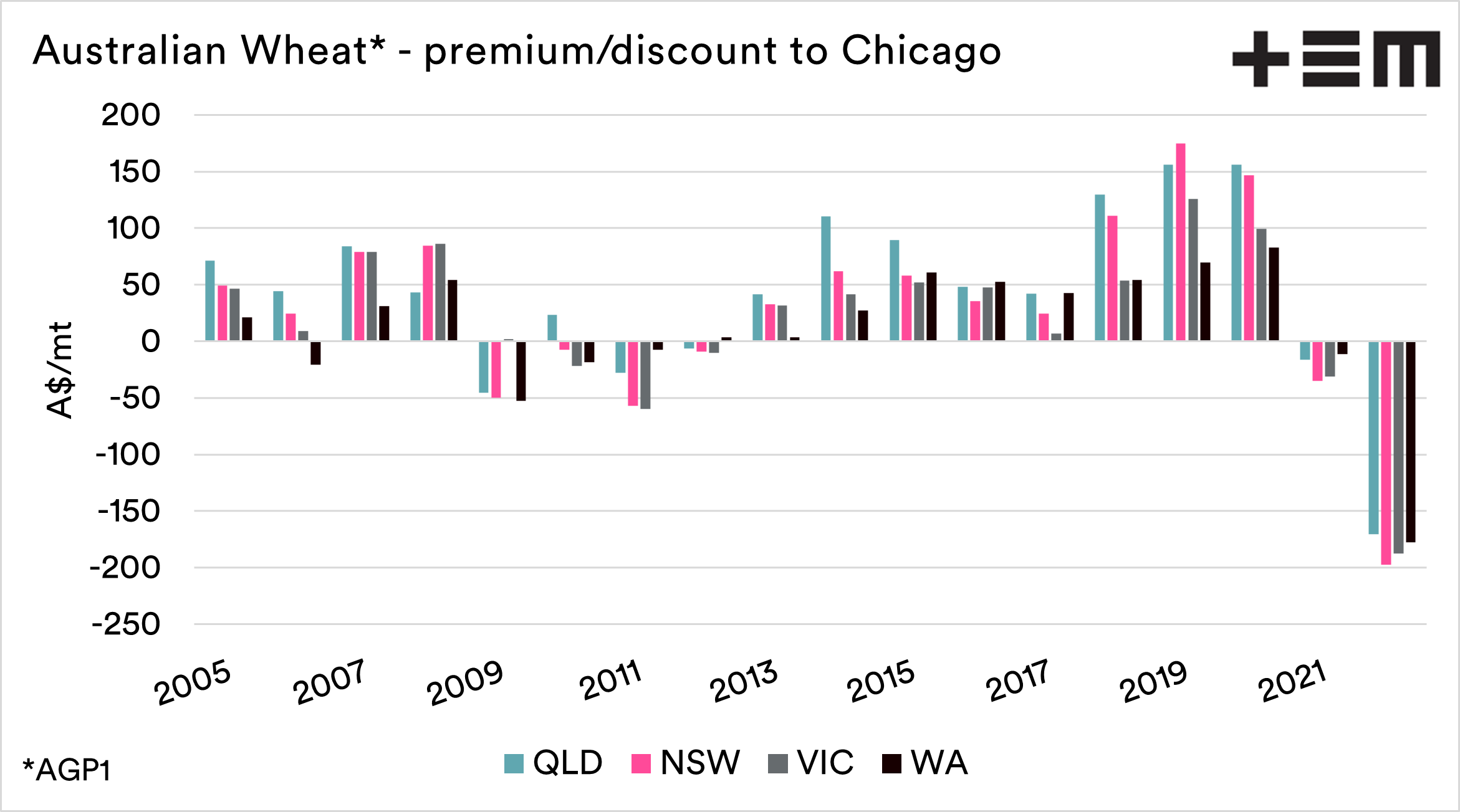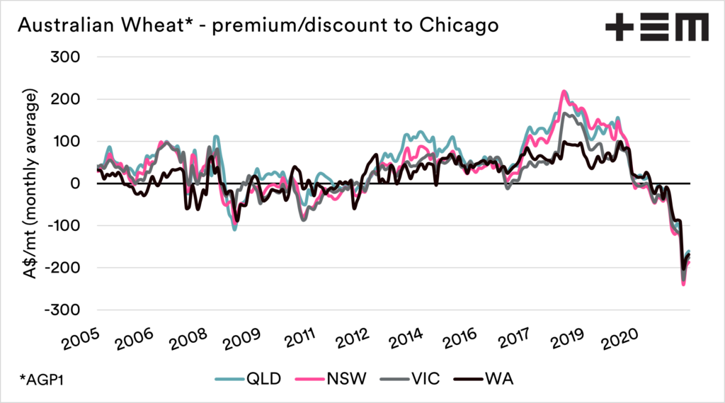 - Relative to Chicago wheat futures, Australian levels are at the largest discount since at least 2002.