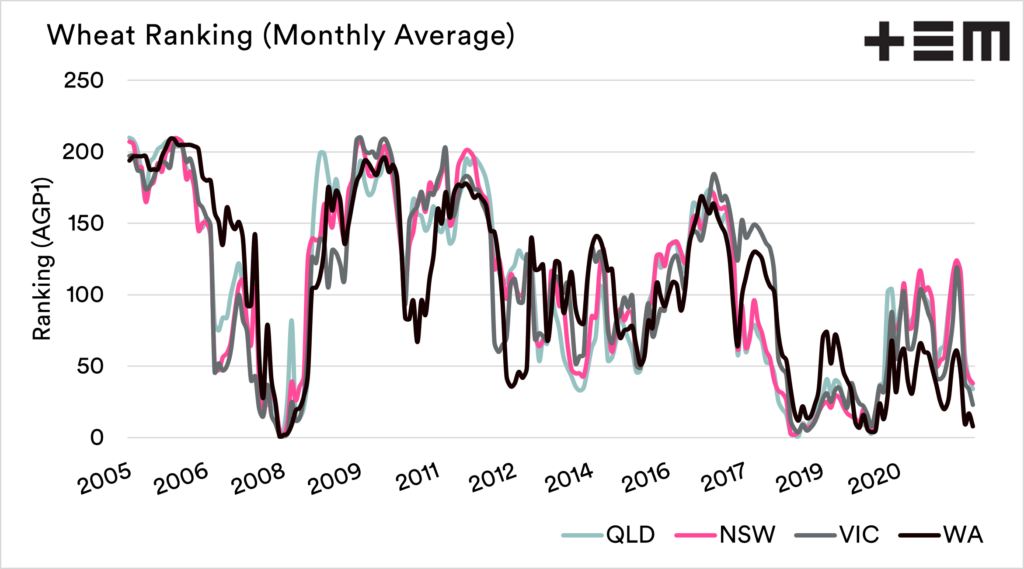 The chart below shows what rank the wheat price was for each month. A lower number equals a higher price and vice versa. Pricing at a flat price level around the country is sitting well. It’s in the top 50 at least.