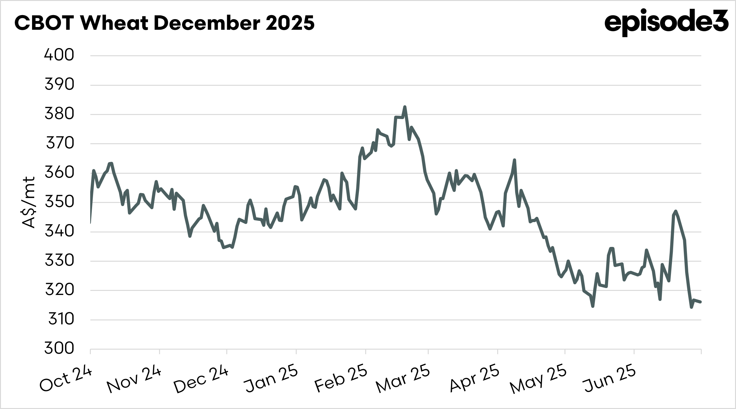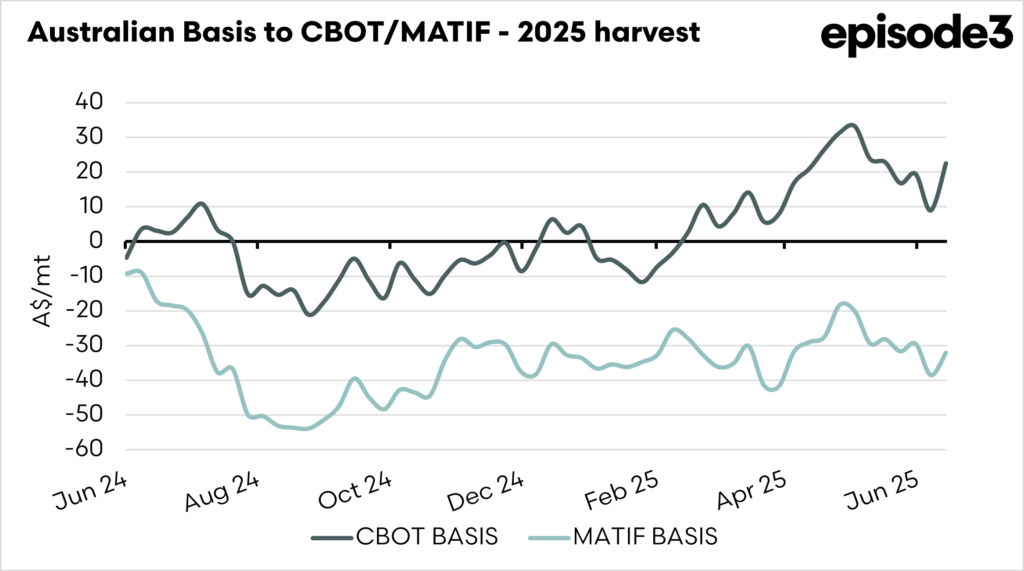 CBOT wheat for the coming harvest fell last week, and was trading at an average of A$323, whereas the previous week it was trading at A$337. At a local level, prices have been slow to follow overseas values, and ASX wheat has remained at the same level as the prior week. This has meant that ASX basis has risen from A$9 to A$23 over CBOT. It wouldn’t surprise me if prices in Australia came under a little more pressure this week. The following bullet points outline the key market points.