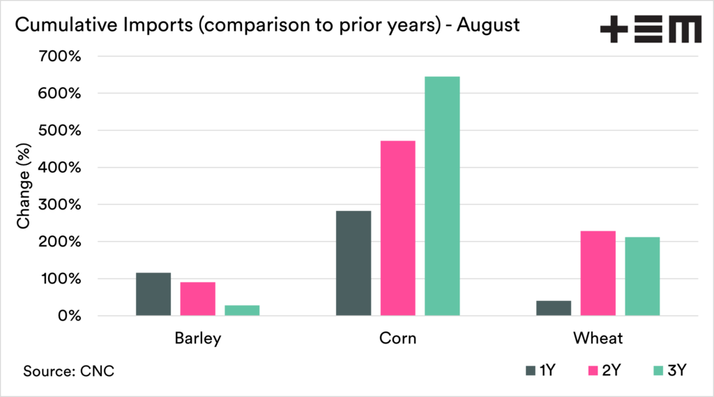 Let’s delve further in, to really see how far Chinese grain imports have come. The chart below displays, the cumulative imports of corn, barley and wheat to August, compared to the same period 1, 2 and 3 years ago.