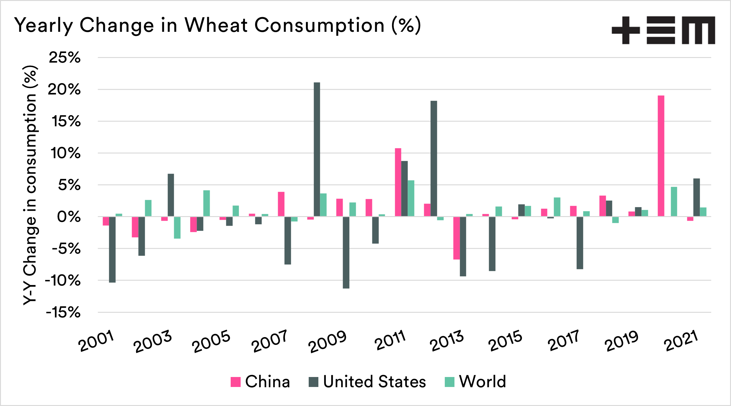 We tend to think of increases in demand as quite linear, and it generally is. Wheat consumption tends to increase by around 1-2% per year.