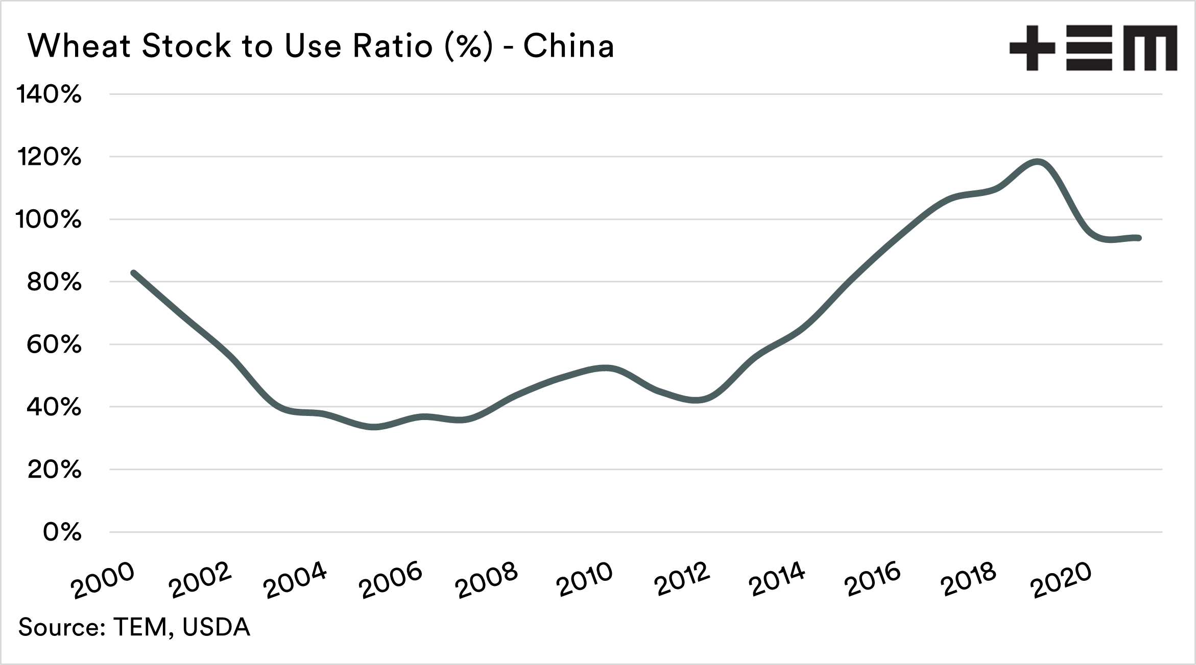 Stocks of grain don’t tell the entire picture. The stocks to use ratio (STU), provides another good insight. The STU gives an overview of both supply and demand. In China, the STU ratio for wheat is 94%.