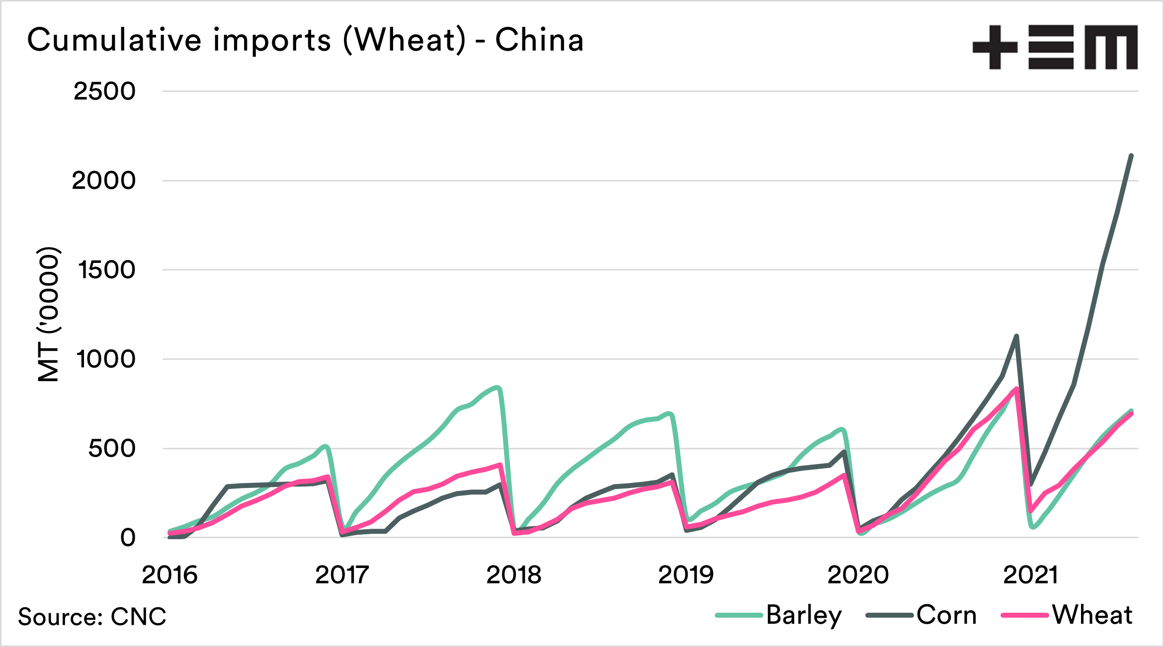 The chart below shows the cumulative imports of wheat, barley and corn since 2016 from all countries to China.