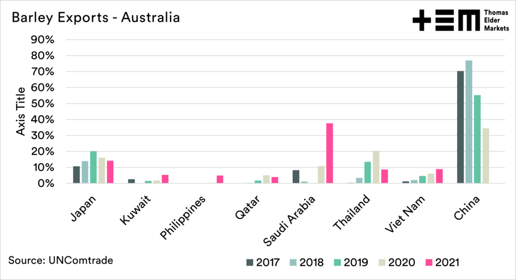 The silver lining of the removal of China has been a slight diversification of our barley export markets. However, I will put A$50 down that within a year or two of China’s door being open; they will be the vast majority of our barley trade again.