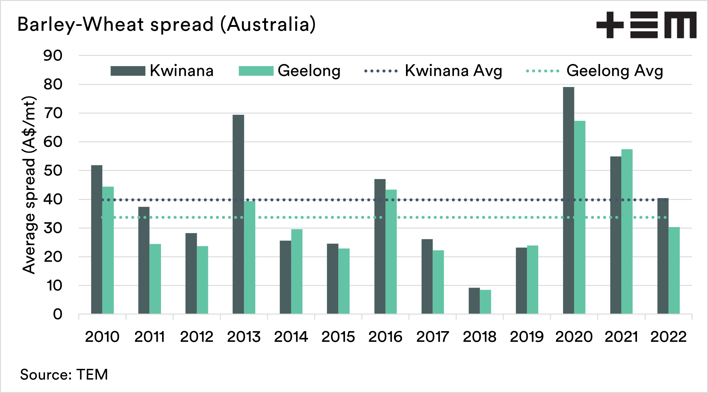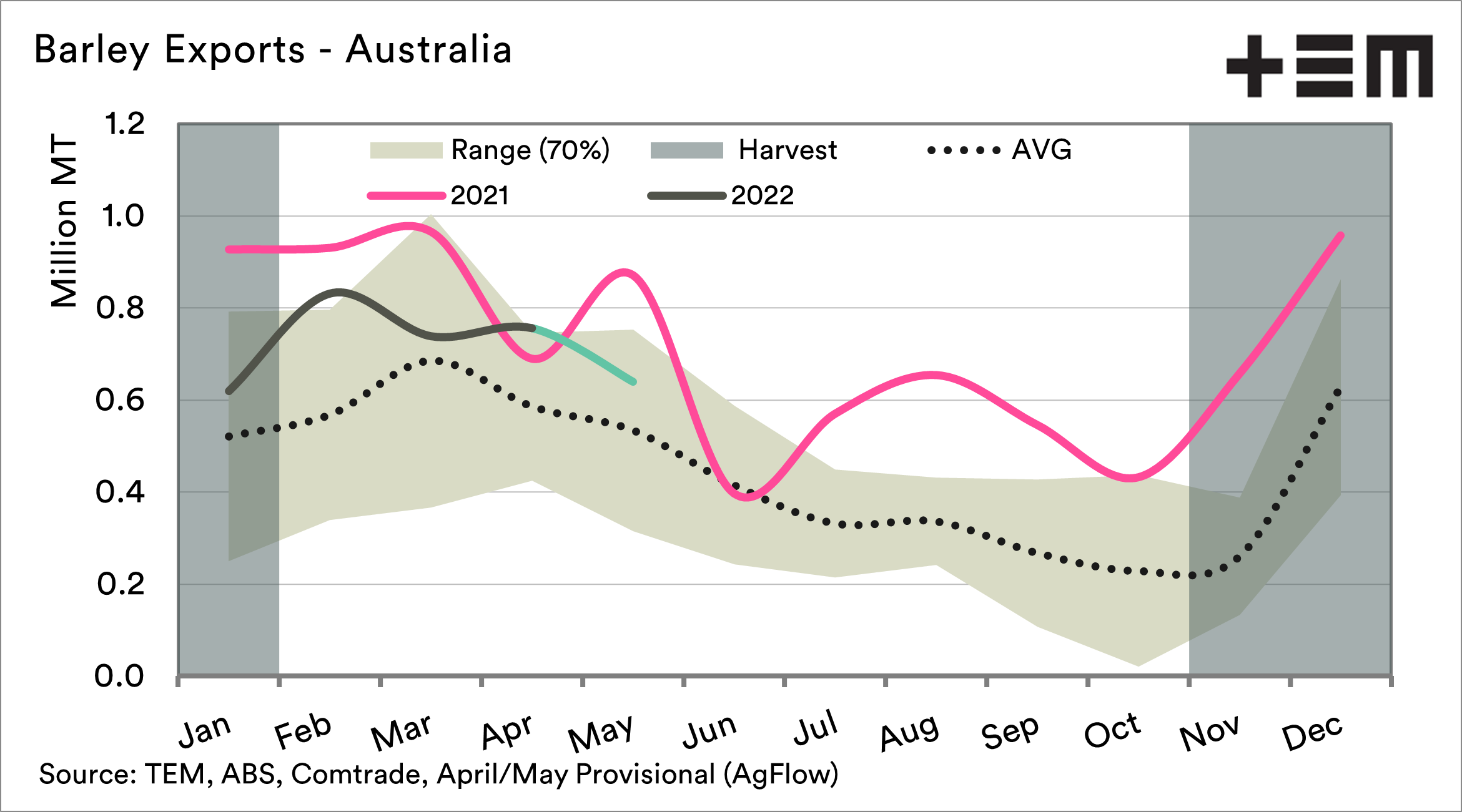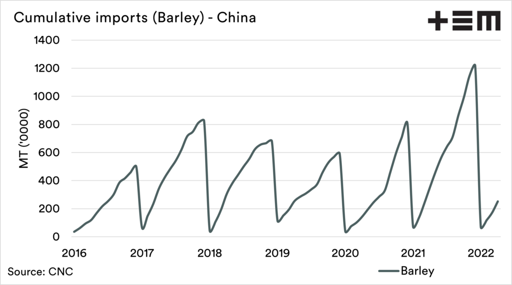 Australia has clearly still been exporting large volumes of barley over the past two years. So far this season, volumes on barley have been lower than 2021.