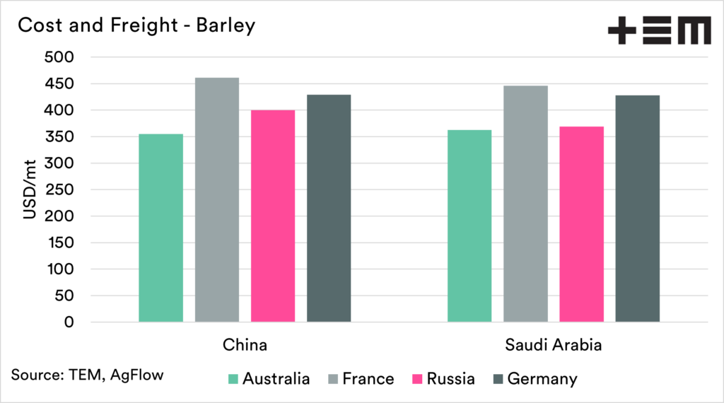 The purpose is to give an indication of the cost of sending barley from origin to destination. In the case of Australia, we have used a modelled price of the grower bid converted to destination. As we can see, we are largely behind the major origins.