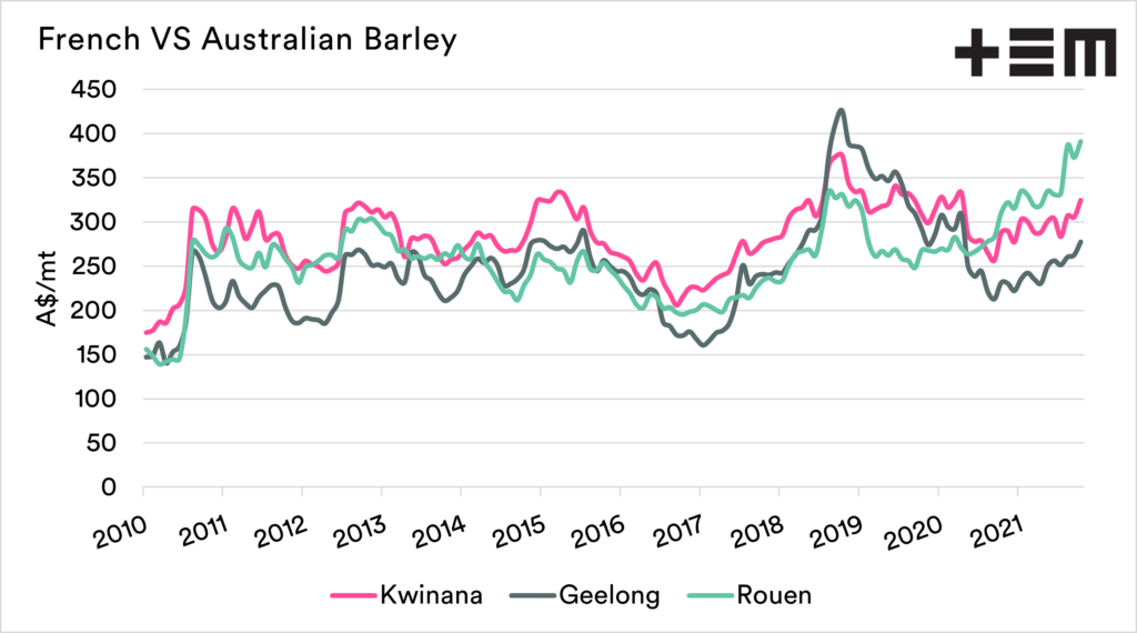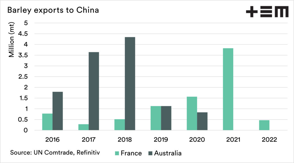 France was one of the main beneficiaries of the effective ban on Australian exports. In 2020/2021, larger volumes of barley flowed from France to China than would be the case if Australia was still in the mix. This is shown in the first chart below.