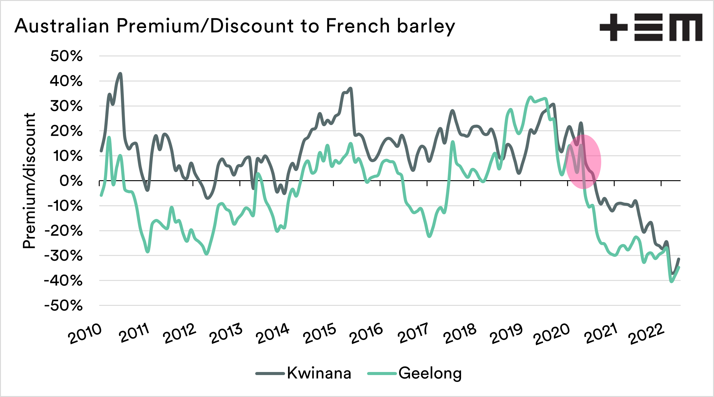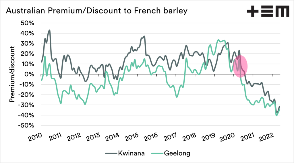 The second chart below shows the premium/discount between Australian and French barley. I have highlighted when the tariff on Australian barley was introduced. The discount increased from this point onwards and remained large.