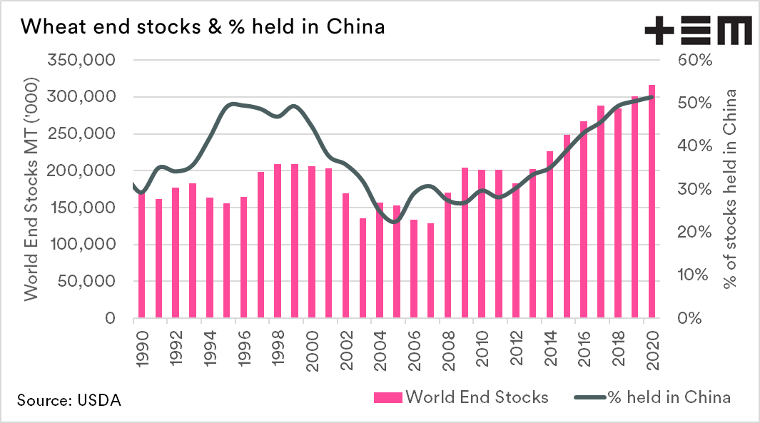 On a global level, wheat stocks are at record levels of 317mmt. It is crucial, however, to note that the majority of these stocks are contained within China (51% of global stocks). These stocks are unlikely (but not impossible) to be offered to the international market.