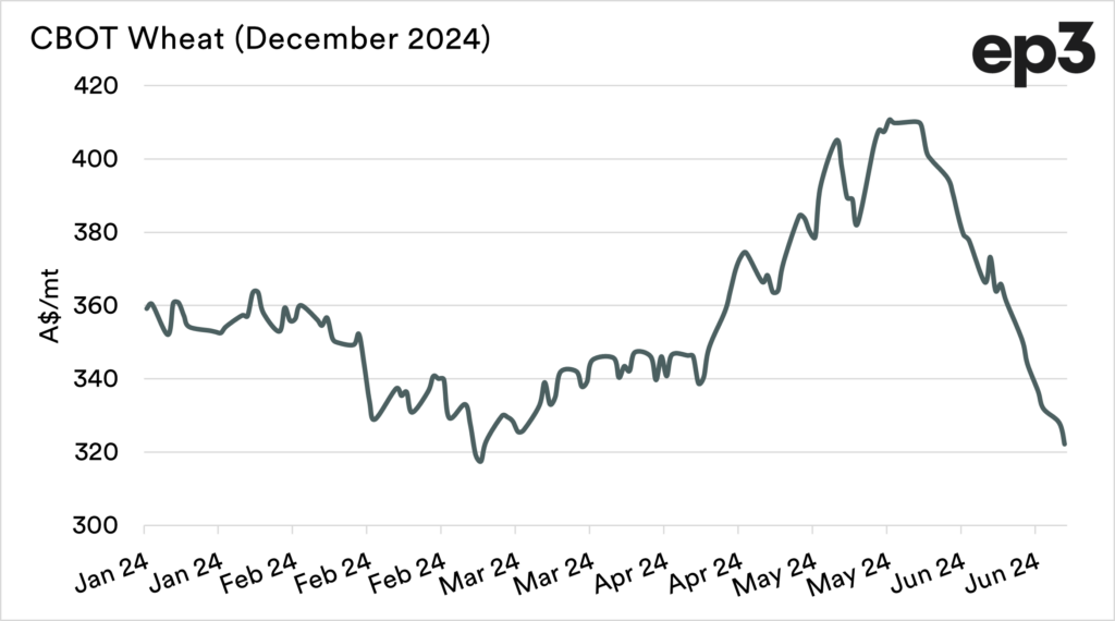 The December wheat contract (Chicago) aligns with our harvest. On the 17th of April, futures were at A$338, and they drove higher to A$410 by the 24th May. The market has since fallen from this peak to hit A$322 this morning.