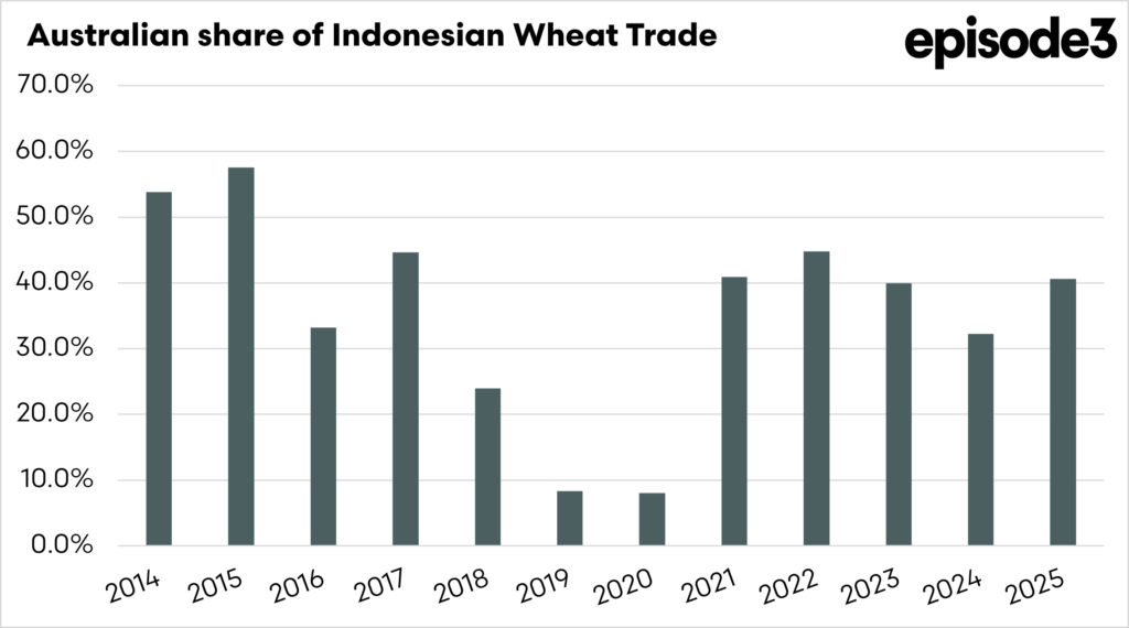 In many years, it has been Australia’s largest single export destination, regularly taking between four and five million tonnes when Australian production is strong. With Indonesia importing around 10 to 11.5 million tonnes of wheat annually, Australian shipments can account for as much as 40 to 50 per cent of the market in large crop years.