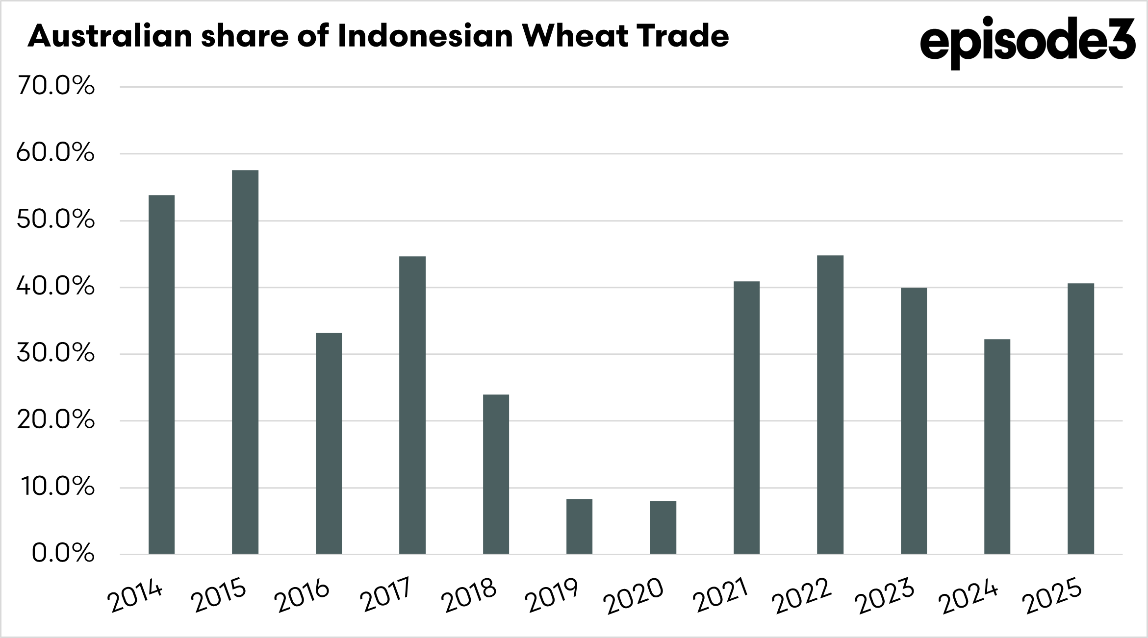 Australia’s exports to Indonesia fluctuate significantly with crop size. In 2017, Australia shipped just over 5.1 million tonnes to the market, while in 2025 shipments again surged to roughly 4.7 million tonnes. In drought years, the figure can fall sharply. In 2019, Australia exported less than 900,000 tonnes to Indonesia as production collapsed. Their market is highly price sensitive; during droughts, they will look to alternative sources.