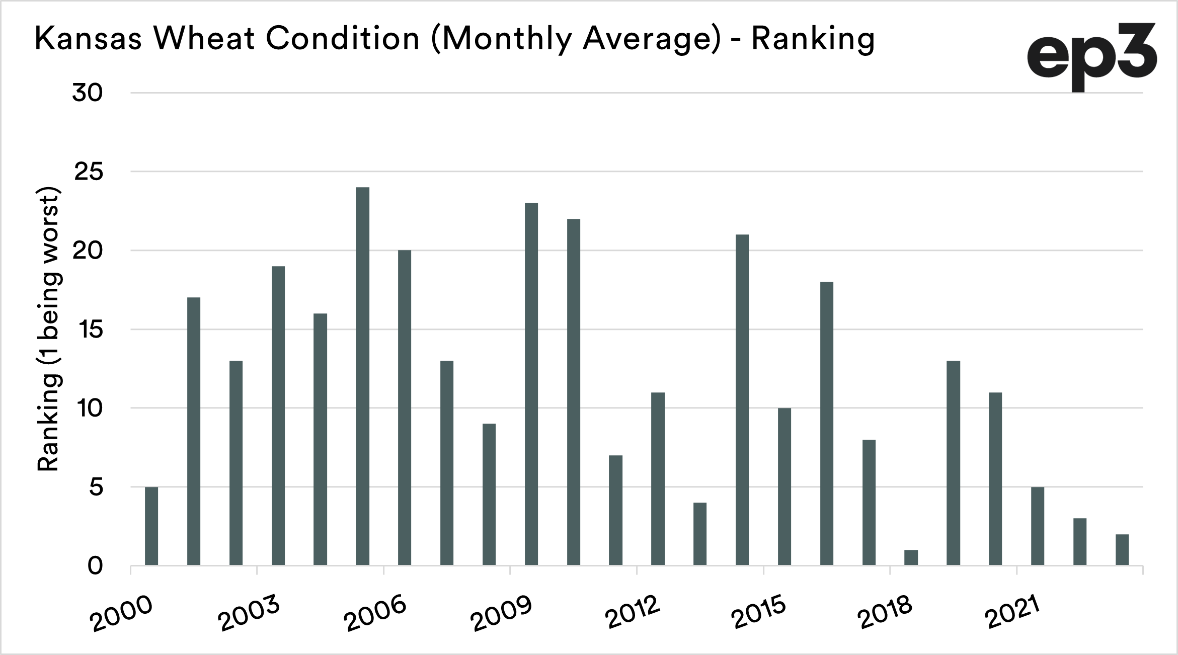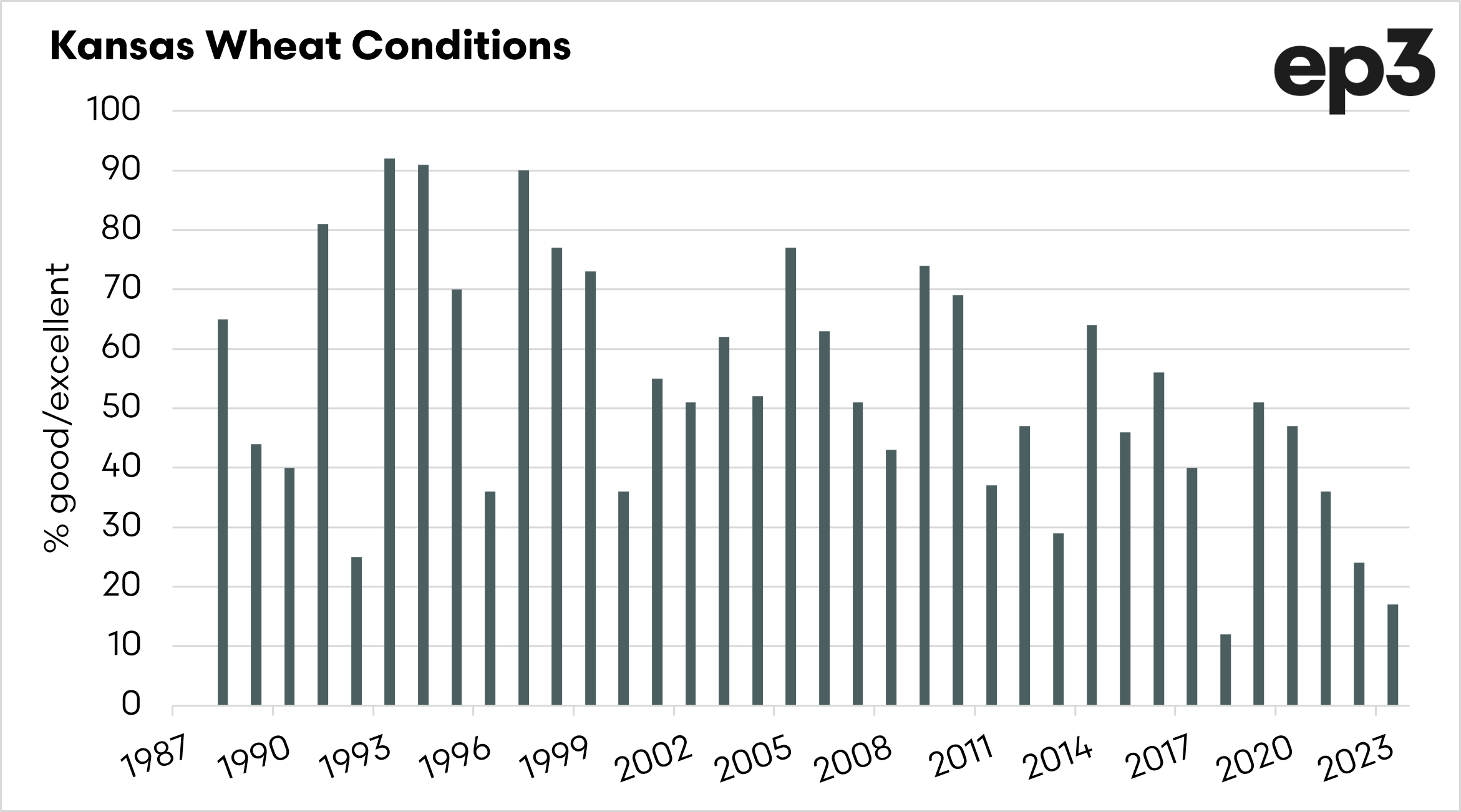 The condition of the crop is also not great. The charts below display the condition of the winter wheat crop in Kansas.