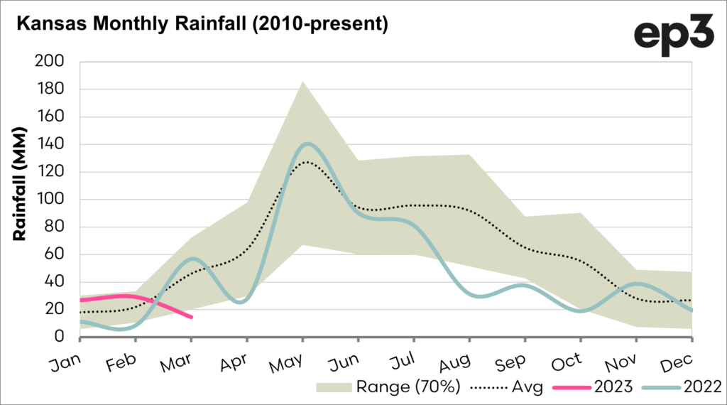 Throughout much of late 2022, Kansas experienced below average rainfall. The state is now according to the US drought monitor, the state is experiencing 36% exceptional drought and 16% severe drought.