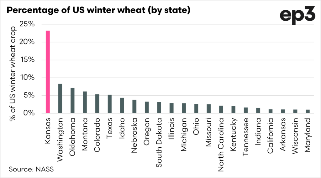 - Kansas is the US state with the largest share of the winter wheat crop.