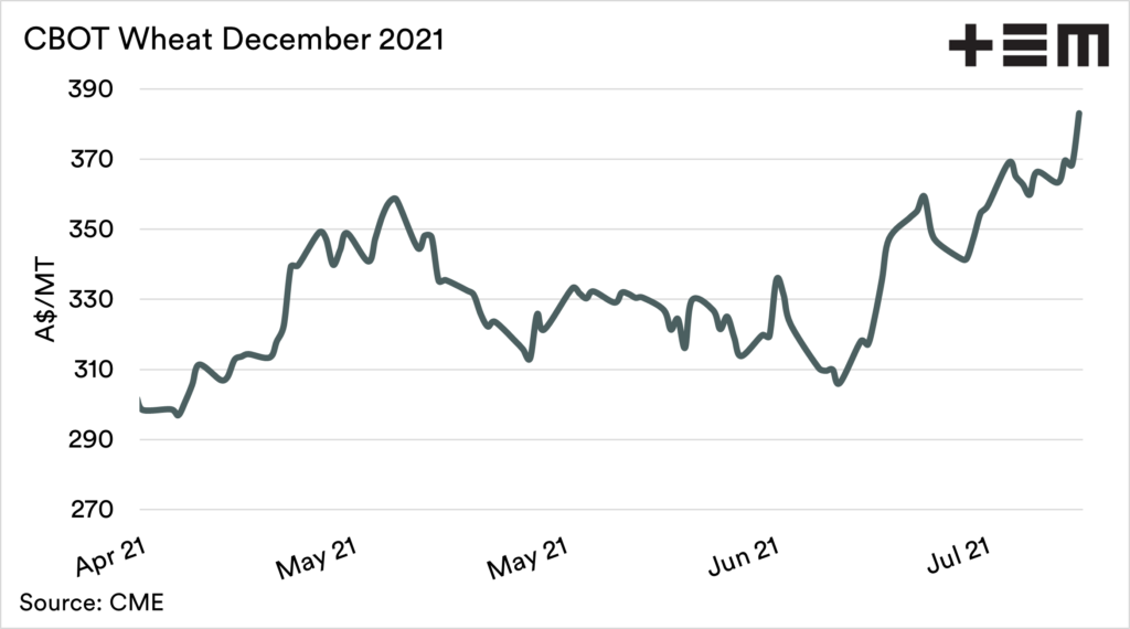 The December CBOT wheat futures have risen A$14.6/mt to A$383. This is a very attractive number. Whilst we still expect basis to remain negative for a while, this keeps the flat price up.