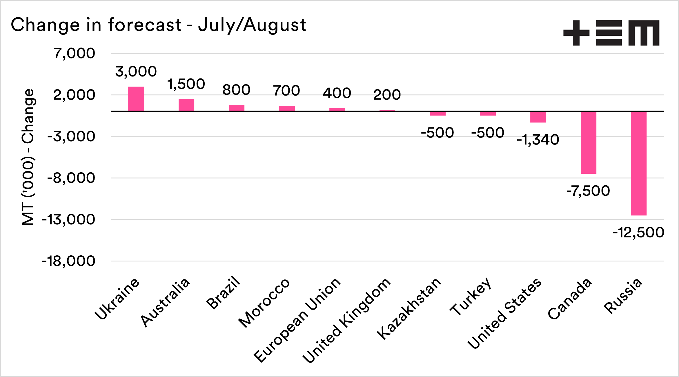 Where are the major changes? There have been upward revisions to Australia and Ukraine, but these don’t outweigh the fall in Canada and Russia.