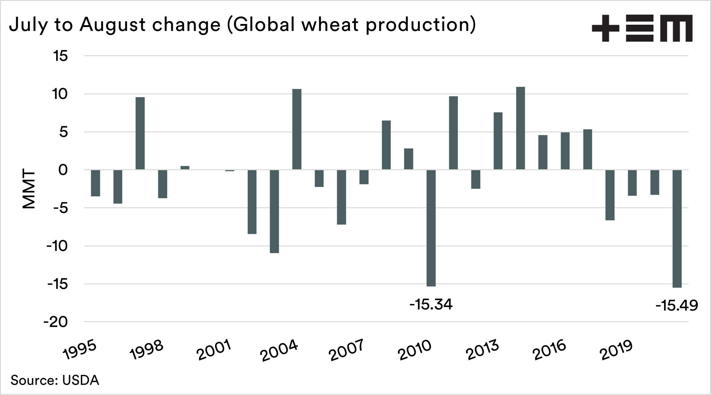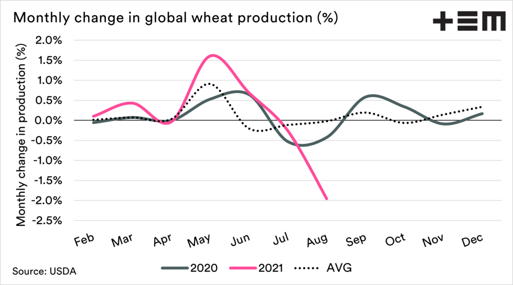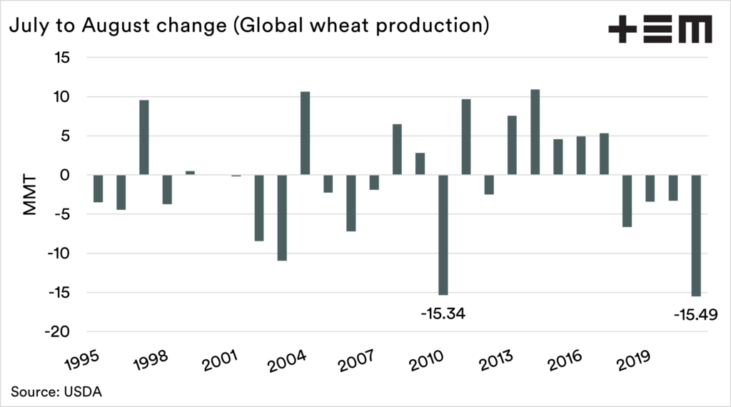 The chart above shows the monthly change in the forecast for global wheat production. The wheat production forecast fell by 2%, which, although it doesn’t sound like much, is a fall of 15.5mmt. To put this into perspective, this is slightly more than half the forecast that USDA has for Australia at 30mmt.