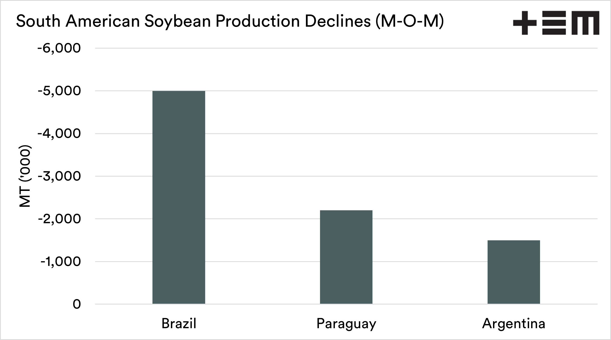 Brazil, Paraguay and Argentina had a combined production drop of 8.7mmt between January and now. However, the USDA balanced the books somewhat with Chinese imports and crush were reduced by 3mmt.