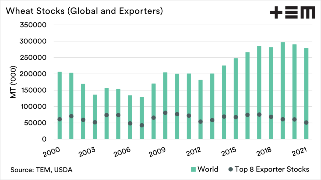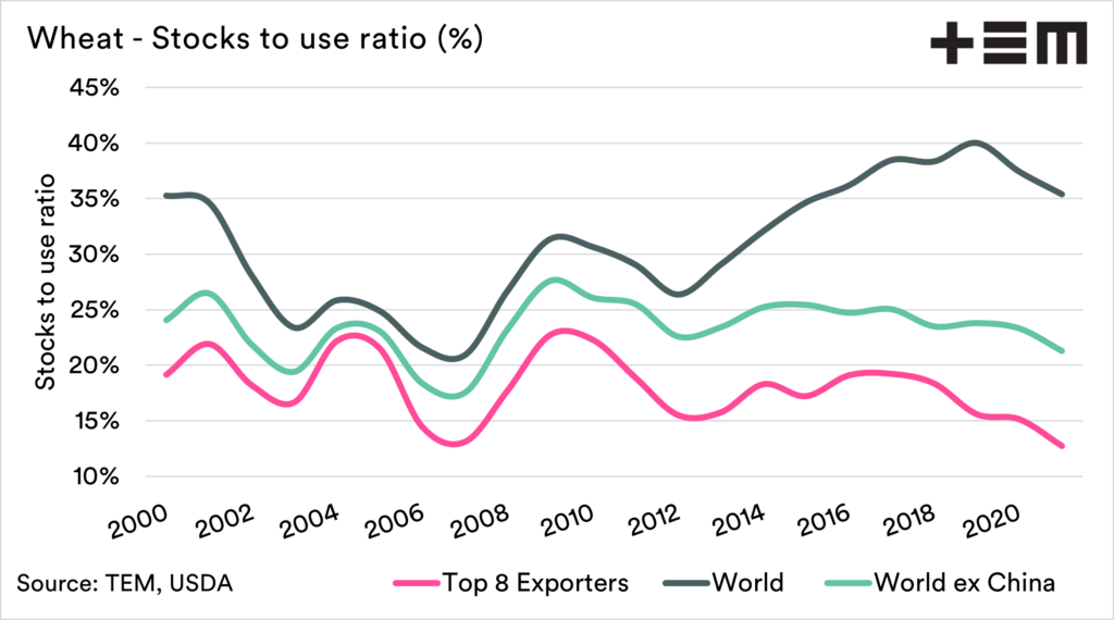 - Wheat stocks to use ratio of leading exporters matching 2007 levels.