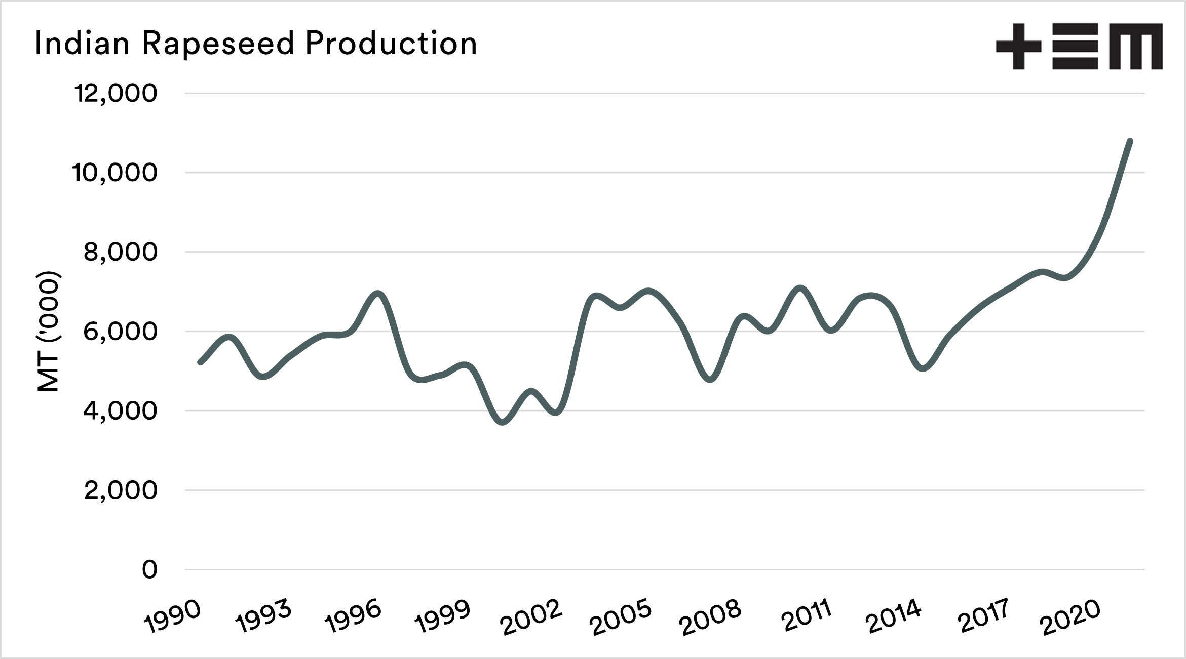 Of interesting note is that Indian canola (rapeseed) production was increased by 1.3mmt to 10.5mmt. This is a forecast of record production, with the average production from 2010 to 2020 at 6.8mmt.