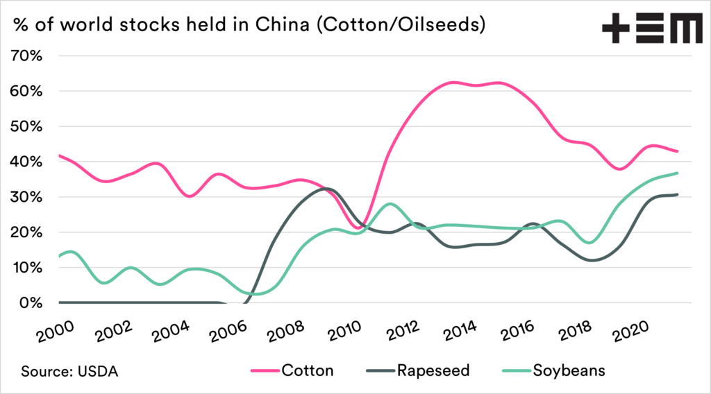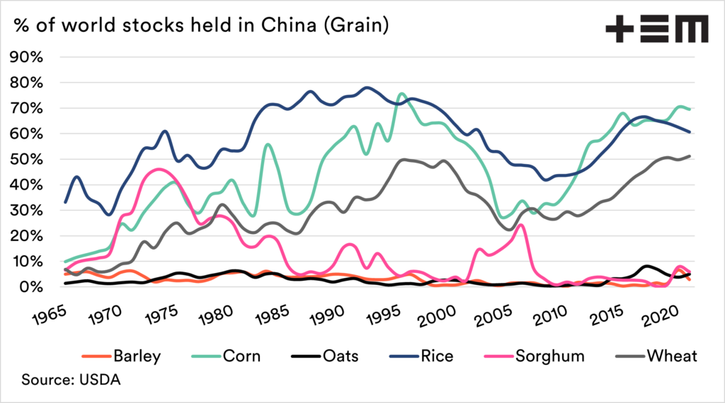One of those is the volume of world stocks of various grains and oilseeds held within China. China, on paper, holds >50% of the worlds rice, wheat and corn.