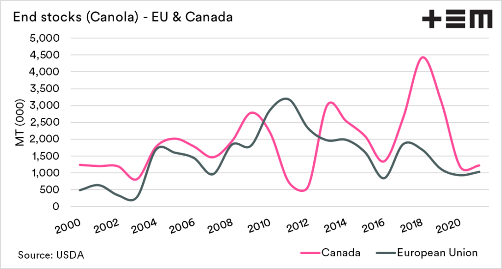 The stocks in Canada are set to fall to 1.2mmt before their new season harvest. This is the lowest level since 2012. The expectation for Canadian production is at 20.5mmt. There remain concerns about dryness in the Canadian crop.