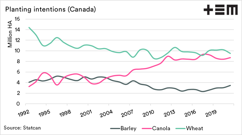 Our commonwealth cousins in Canada are at the start of their seeding phase, and their national statistics agency has released their updated planting intentions. Last week we spoke about the state of canola in ‘Canada poutine on the fireworks’. In this article, we will go through the state of all the major crops.