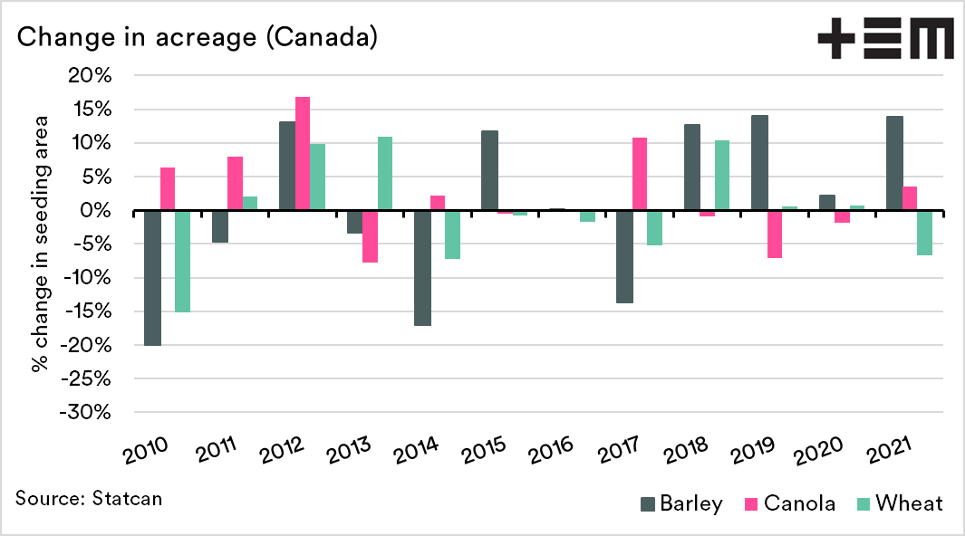 Barley, on the other hand, has seen an increase of 14%, year on year. The area set to go into barley is the highest since 2009. This is at a time when with Australia locked out of China, Canada is winning volume into our old customer.