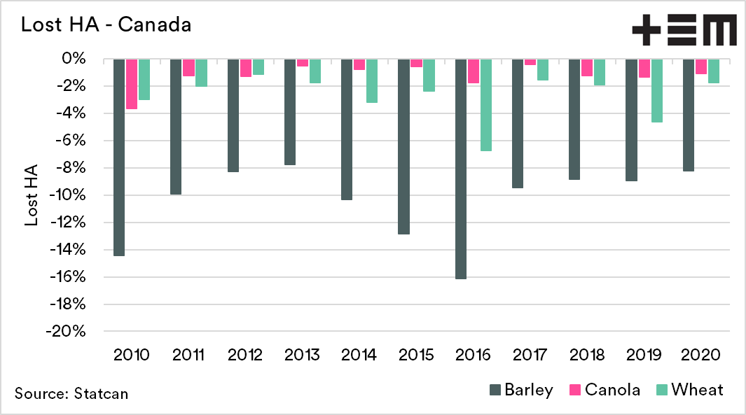 As we can see in the chart, there are regularly very large hectare losses. The story of Canadian seeding is not over yet; whilst there have been swings in barley and canola, we could feasibly see abandonment – especially if a dry season persists.