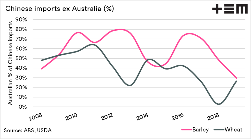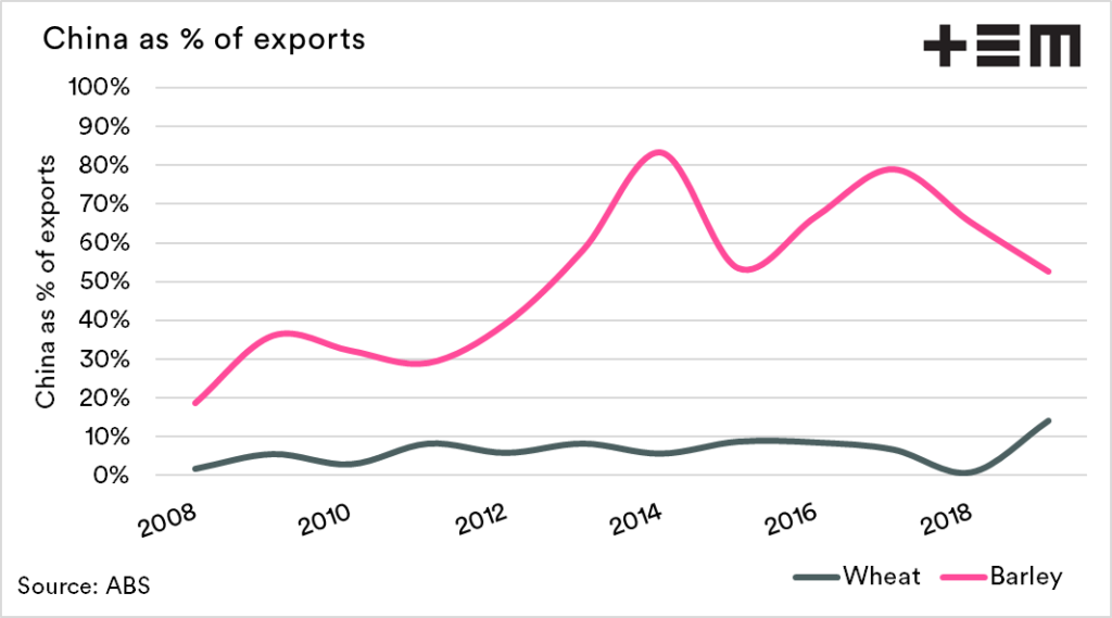 The obvious and glaring point is how reliant Australia has been on barley during the second half of the last decade. On average, 63% of our barley exports were destined for China. This wasn’t considered a bad thing, as China was paying the best price.