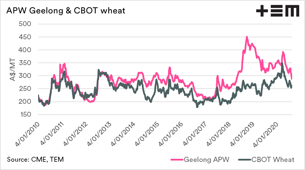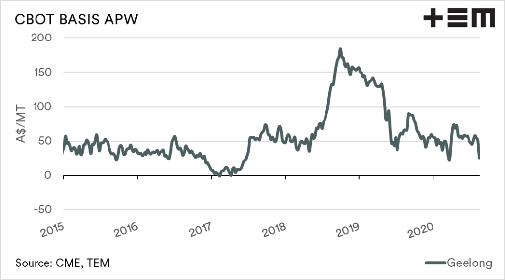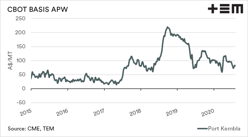 In general, in Australia, basis is a comparison of against CBOT soft red winter wheat (in A$/MT). Although whether CBOT is the relevant indicator is a discussion for another day.