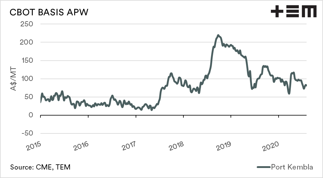 The converse occurs when Australia has a good year. When the local supply of grain is at a large surplus, the basis level declines, as the domestic market does not have to pay up to cover requirements.