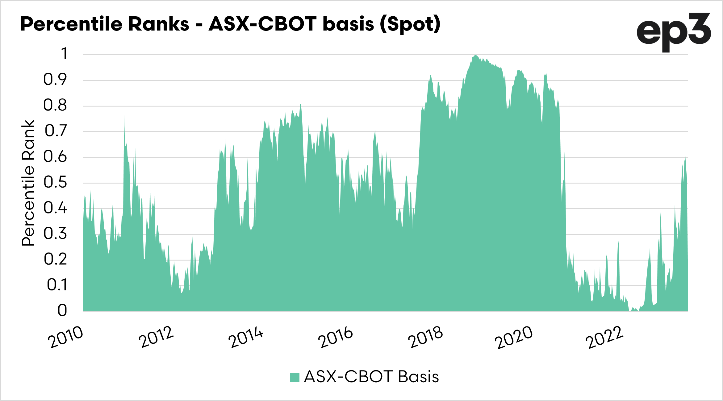 The basis level can be either positive (premium) or negative (discount) to CBOT futures. Australian basis levels tend to be positive, with very minimal time at neutral or negative levels.