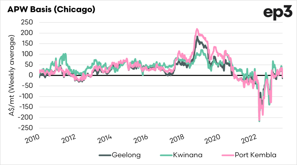 The converse occurs when Australia has a good year. When the local supply of grain is at a large surplus, the basis level declines, as the domestic market does not have to pay up to cover requirements.
