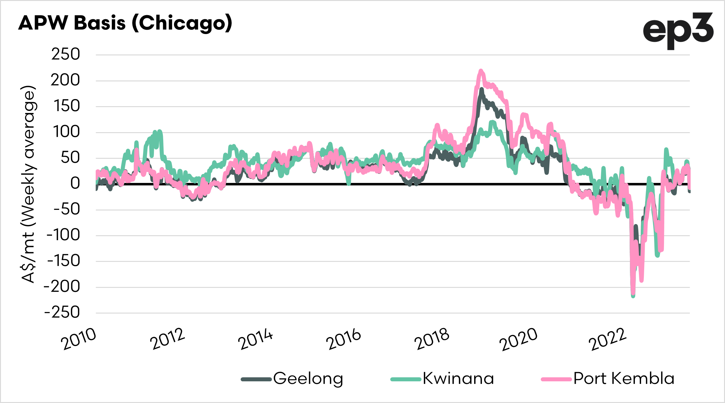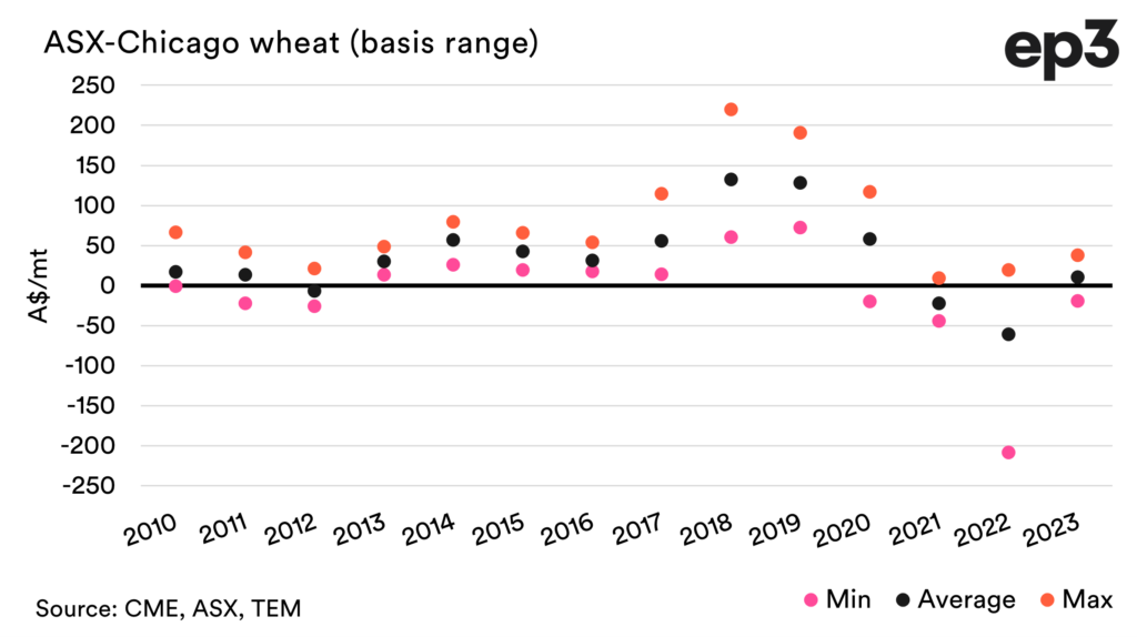 Australia has historically held a premium over Chicago wheat futures. This has made it possible to utilise risk management strategies using swaps/futures which typically have been quite easy to put together. You locked in futures when the futures level was high, and then you banked on having a positive basis later. So it was, for many years, futures plus basis.