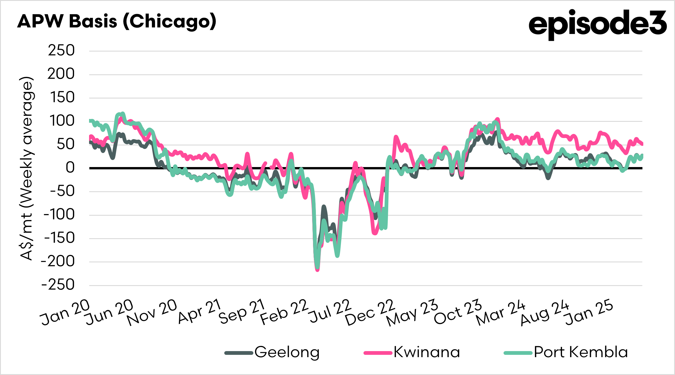 In general, in Australia, basis is a comparison of against CBOT soft red winter wheat (in A$/MT). Although whether CBOT is the relevant indicator is a discussion for another day.