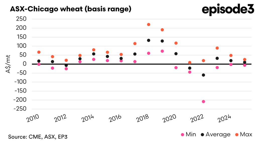 Australia has historically held a premium over Chicago wheat futures. This has made it possible to utilise risk management strategies using swaps/futures which typically have been quite easy to put together. You locked in futures when the futures level was high, and then you banked on having a positive basis later. So it was, for many years, futures plus basis.