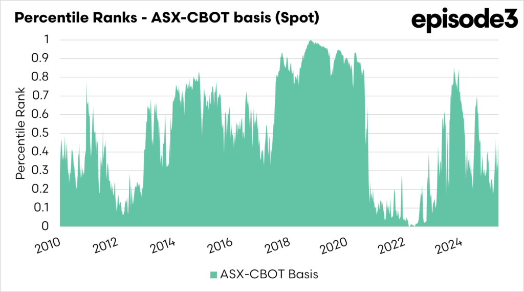 The basis level can be either positive (premium) or negative (discount) to CBOT futures. Australian basis levels tend to be positive, with very minimal time at neutral or negative levels.