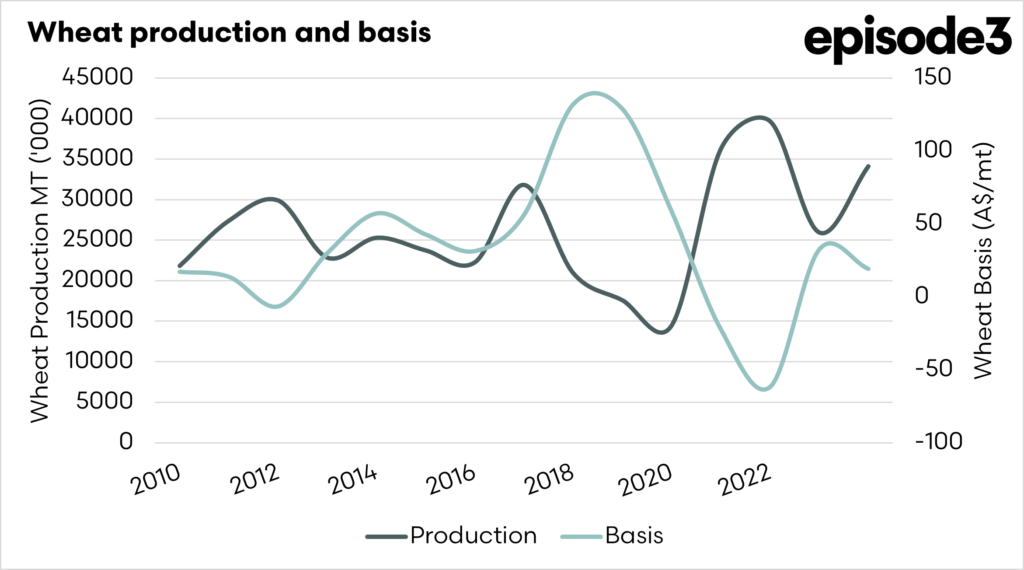 The converse occurs when Australia has a good year. When the local supply of grain is at a large surplus, the basis level declines, as the domestic market does not have to pay up to cover requirements.