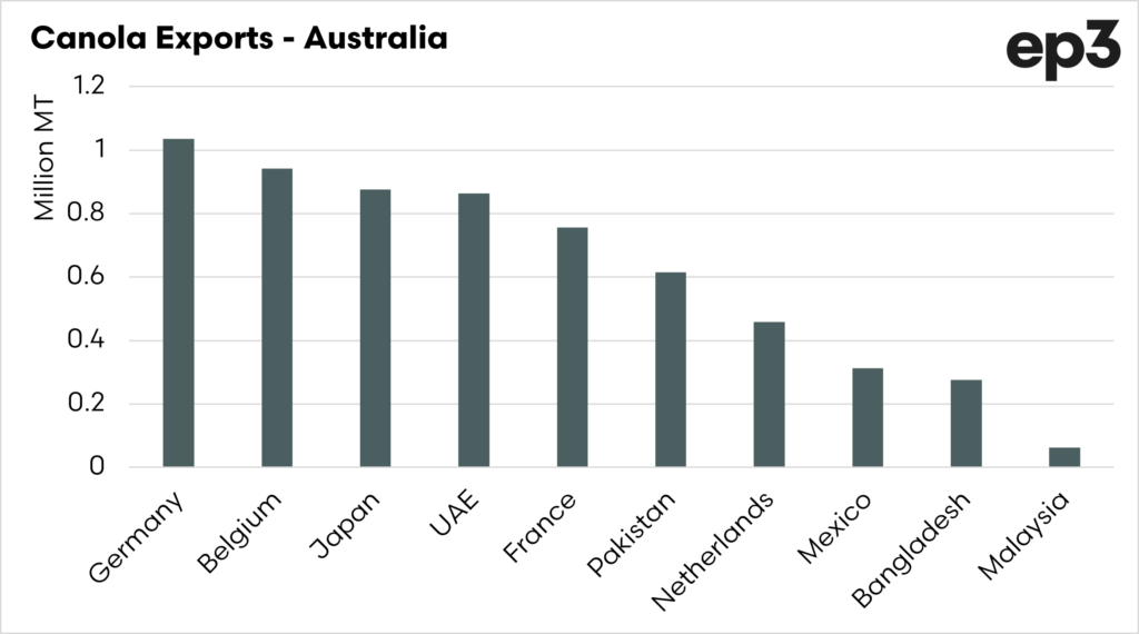 The canola market is heavily skewed towards Europe; in the chart below, the top ten export destinations for canola are displayed. If we add up the European countries, which are the same for all intents and purposes, over 57% of the total volume went to Europe.