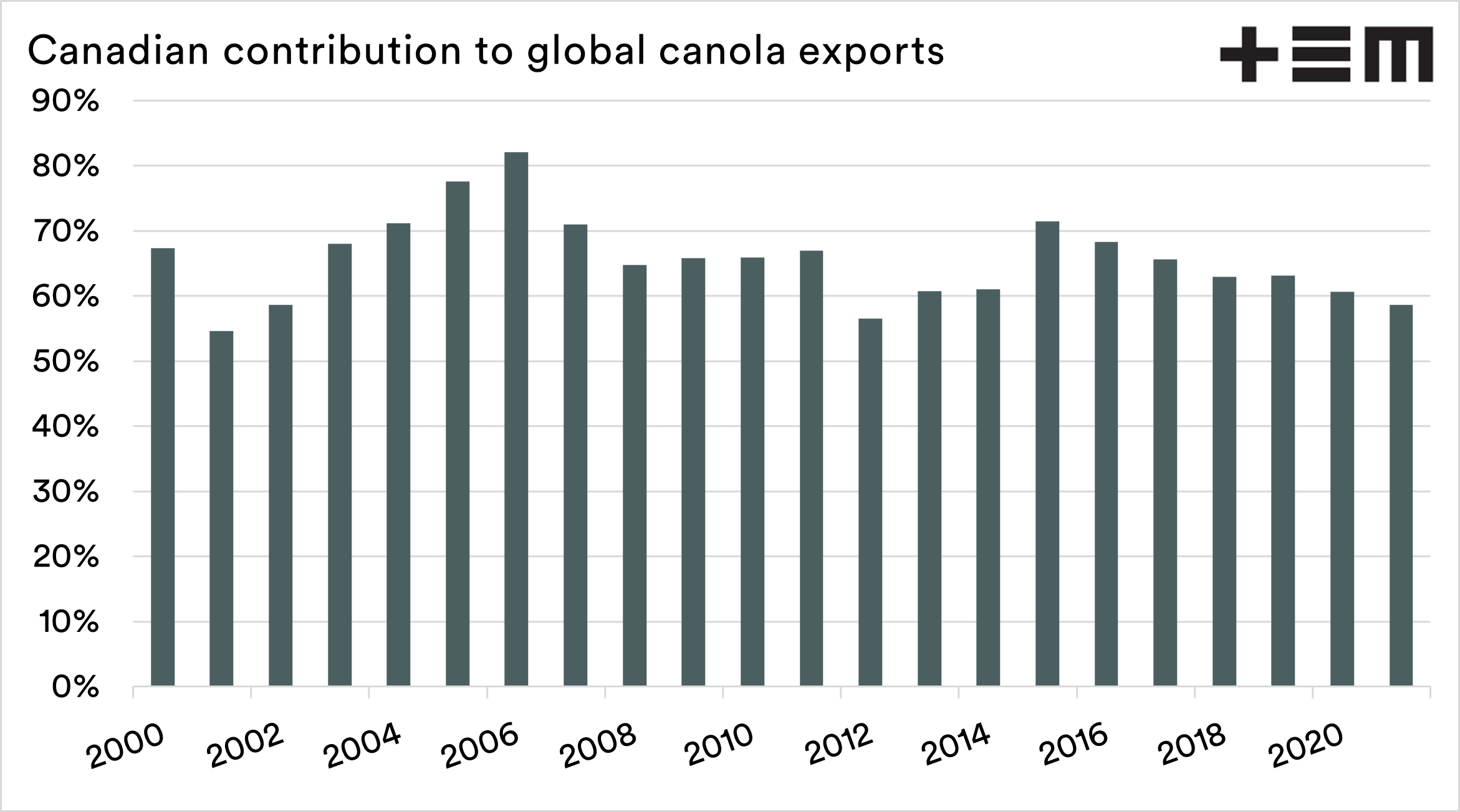 - Canada supplies >60% of the world’s trade of canola.