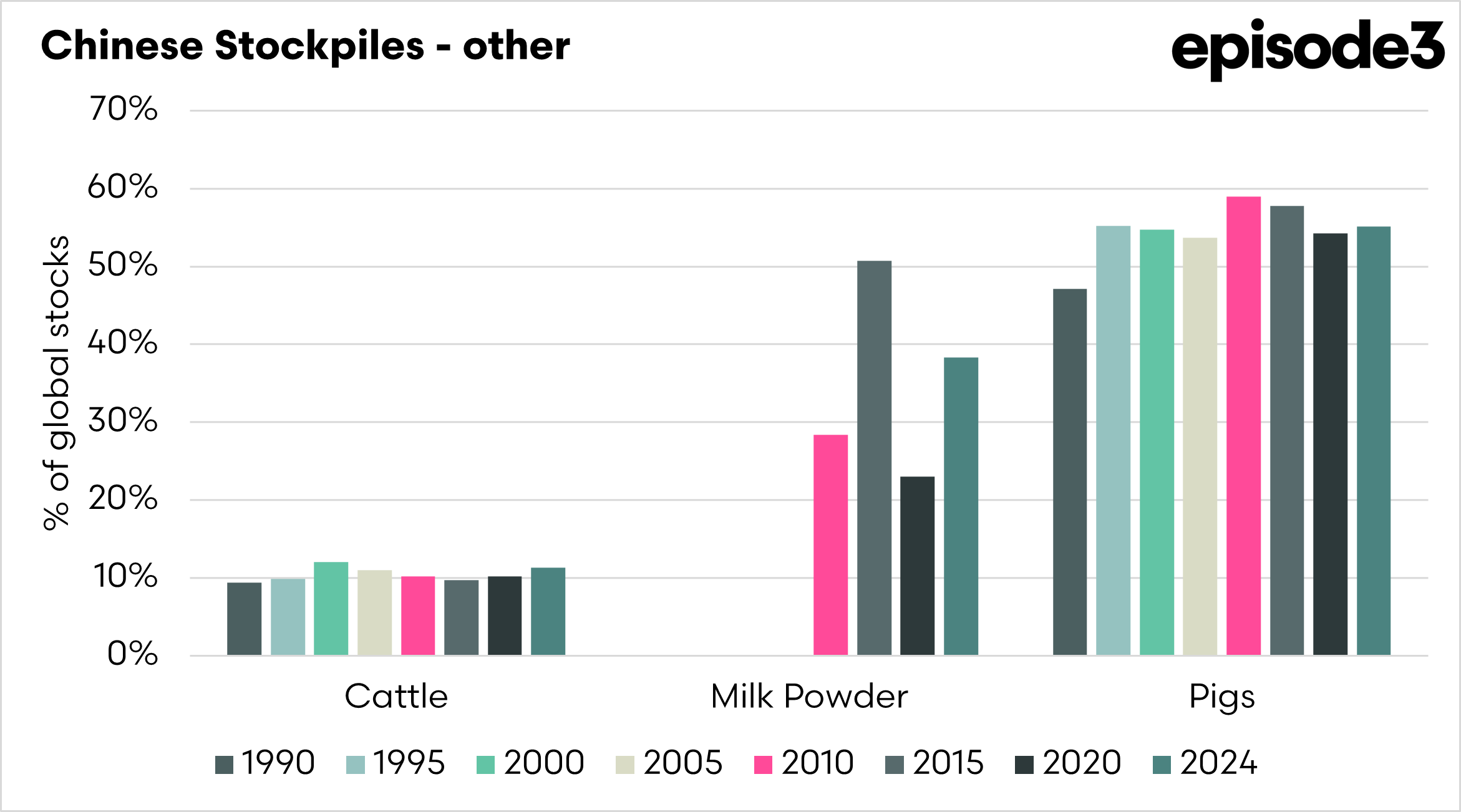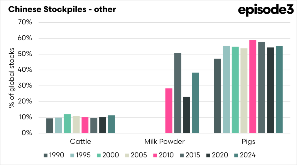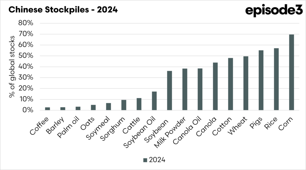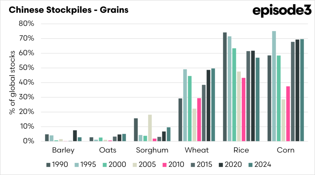 - China holds 50%+ of global wheat and rice, 70% of corn reserves.