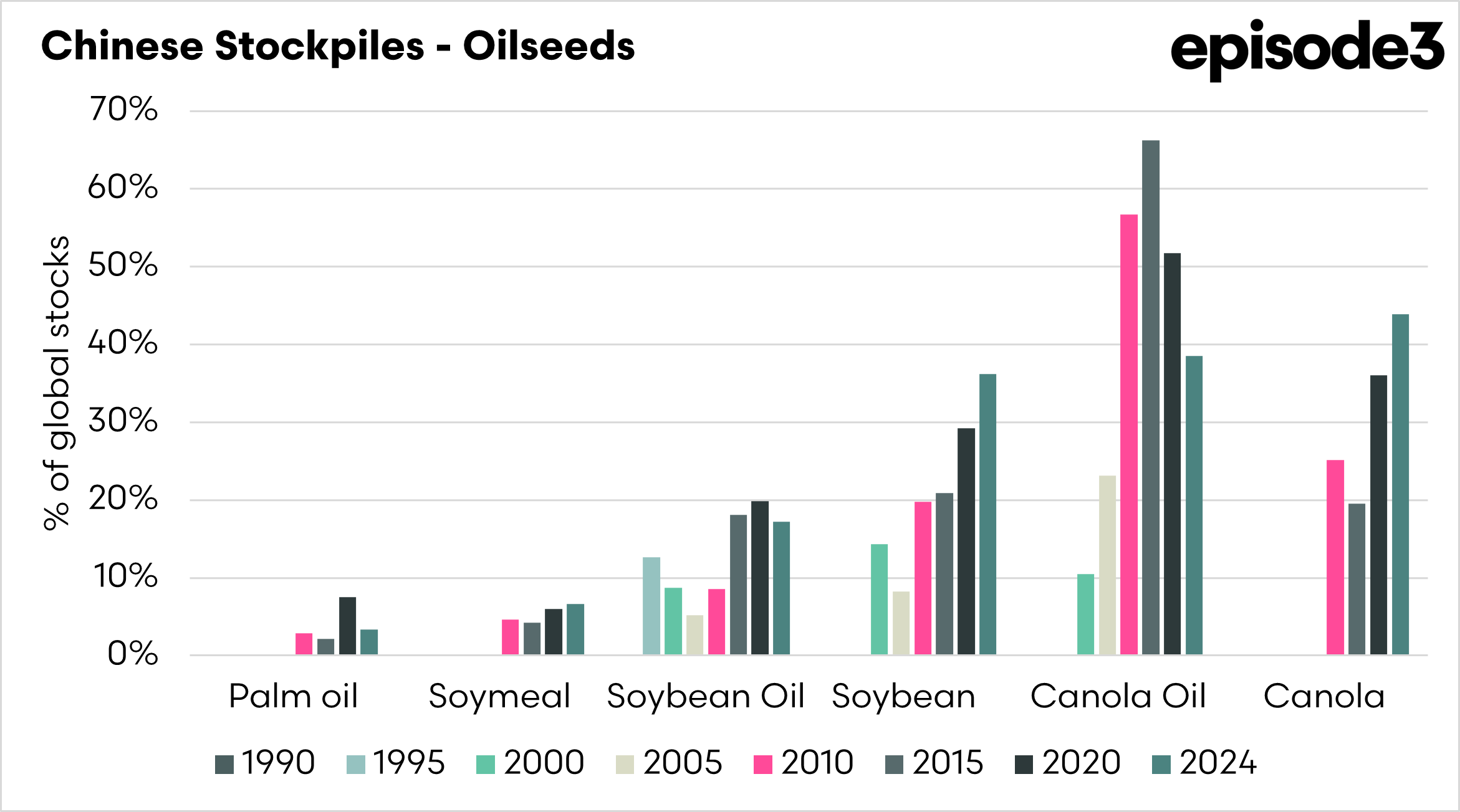 - China is hoarding key commodities like grain, soybeans, pork, and seed oils for stability.