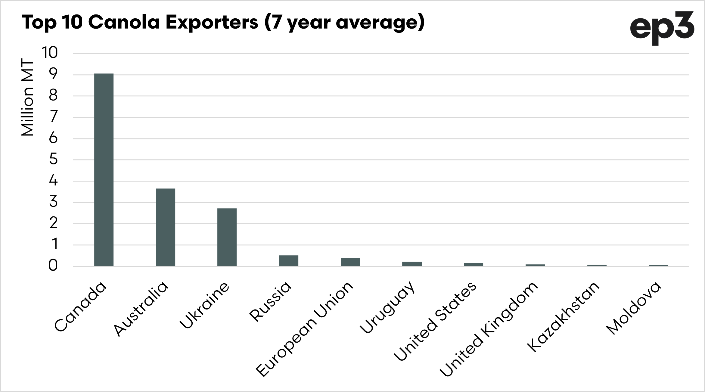 Let’s look at it in a little more detail because in recent years it hasn’t just been Canada facing turmoil. The chart below shows the top ten canola exporters (based on 7 year average). As we can see in this chart, Canada is dominant, with Ukraine and Australia following behind. The rest are largely rats and mice.